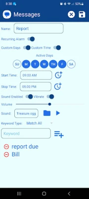 You can customize the alert for specific days or times. You can choose to play specific sounds and/or vibrate. You can match on any of your keywords or all of your keywords. You can also disable any alert that you like or even all alerts.