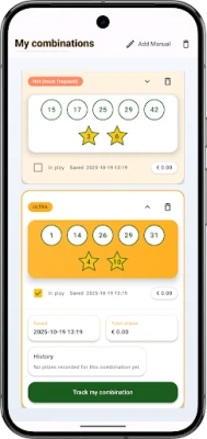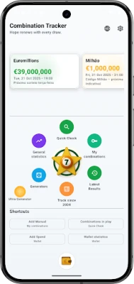 Combination Tracker helps you follow draws, check your numbers and manage your Wallet: record bets, prizes and track your balance through a simple dashboard with charts.