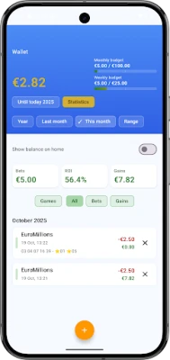 Wallet: record bets and prizes and monitor your real performance in a dashboard view with balance charts and summaries by record type.