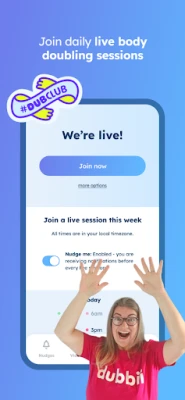 dubbii subscribers can access the full list of tasks, body doubling sessions, create unlimited nudges, and track your progress to unlock badges by purchasing a dubbii subscription. We believe in avoiding the ADHD tax that comes from setting up payments and only remembering when the time comes to renew. Annual subscribers will be reminded ahead of their automatic renewal date and, if you haven’t used the app for a while, we’ll ask in advance if you still want to keep it active.