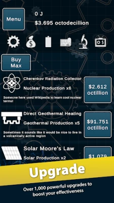 Idle Power features multiple sections that contain hundreds of upgrades and fun things to do, including generating power, selling power, a battery merge game to increase your profits, and a suite of prestige mechanics to start over and expand even faster. Expand your influence across the cosmos and remember: Never slow down.