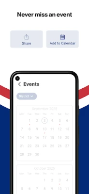 NEVER MISS AN EVENT The event section shows a list of events throughout the district. Users can add an event to their calendar and share the event with friends and family with one tap.