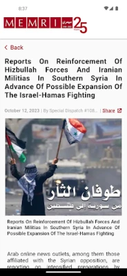 MEMRI has been bridging the language gaps between the West and the Middle East, Iran, South Asia, and North Africa for 15 years. Download the MEMRI app today to access the latest content that you wont see anywhere else - unique video, translations, and analysis of the media of the region - and to quickly share content via Twitter, Facebook, and email - all for free.