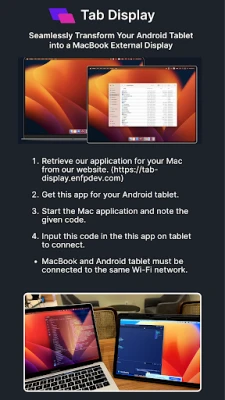 📲 Tab Display allows users to seamlessly transform their Android tablet into an external display for their MacBook or Windows desktop or laptop. With this app, users can extend their screen and receive video of the virtual display on their Android tablet. It supports both wireless connections using Wi-Fi and wired connections through USB tethering.